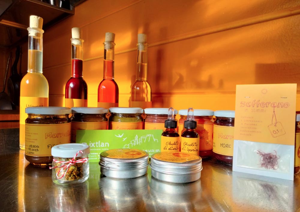 L’azienda agricola Ixtlan è piccola, appena due ettari, situata in collina in prossimità del paese di Tatti. Nell’azienda Valeria e Guido, con l’aiuto dei loro figli Zeno e Elio, coltivano un’ottantina di olivi, alcuni alberi da frutto, un orto biologico, una piantagione di zafferano.