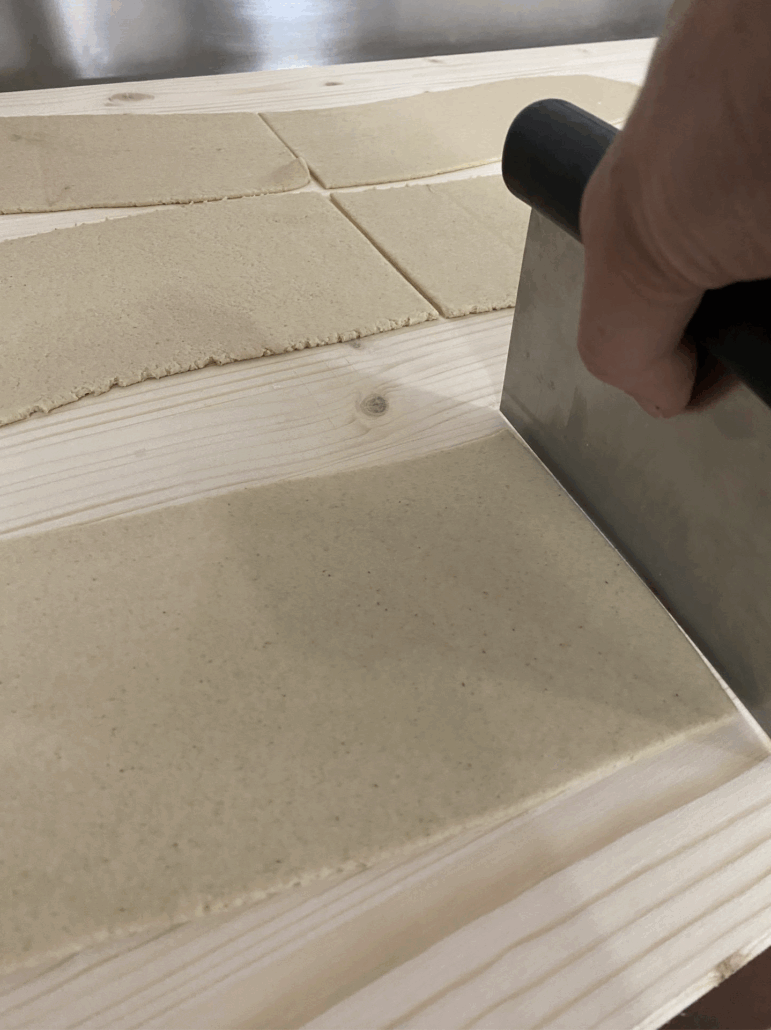 Maltagliati: impastiamo a mano e li tiriamo con la macchina per ottenere una sfoglia omogenea, infine li tagliamo a mano al coltello.