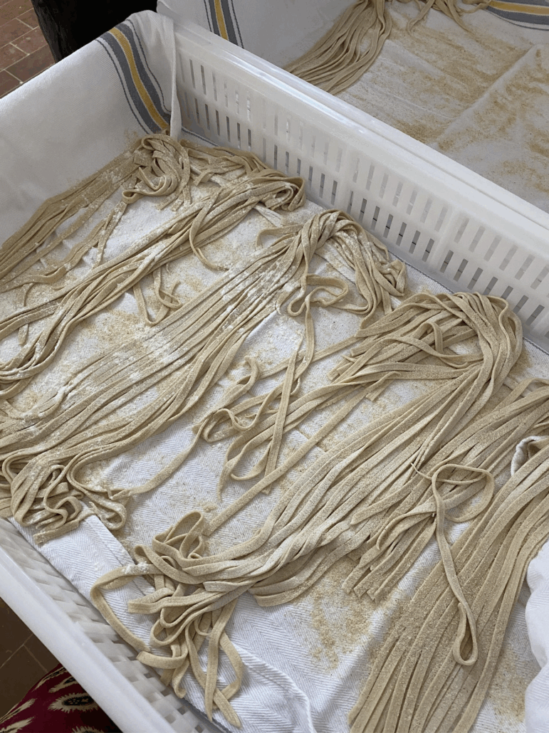 Tagliatelle: impastiamo a mano le tiriamo le tagliatelle a macchina, utilizziamo una macchina manuale per tagliarle nel formato perfetto.