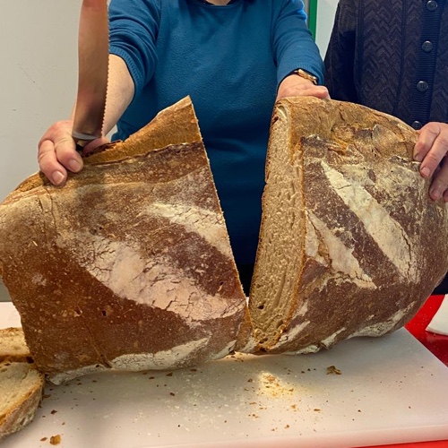 Pane di piu di 2 kg diviso a metà, prodotto con farina acciaio locale, a lievitazione naturale.