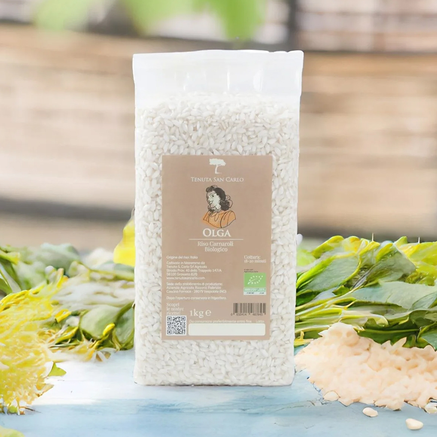 “Olga” è il riso Carnaroli bianco, ideale per risotti o in bianco, prodotto nel Parco Regionale della Maremma, Grosseto, dall’azienda agricola bio Tenuta San Carlo.