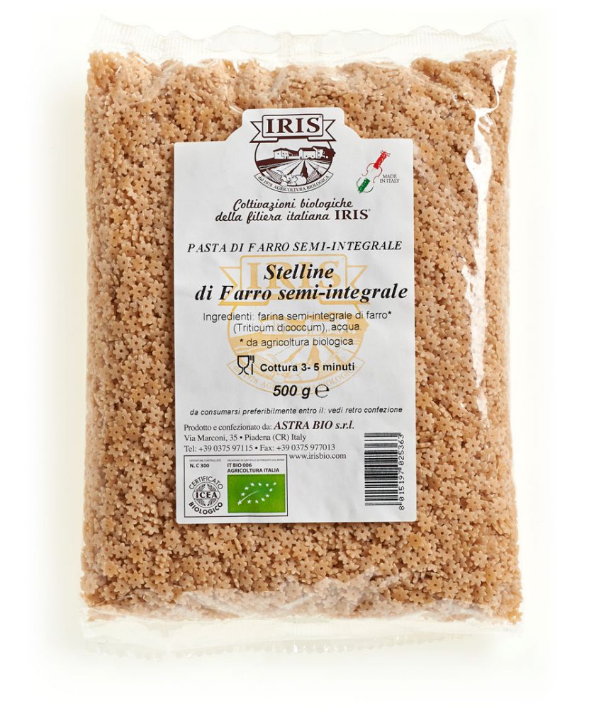 Pasta di farro Triticum dicoccum semi-integrale trafilata al bronzo. Questo cereale è antichissimo, si trovano documenti sulle coltivazioni già dal tempo degli Etruschi, digeribile e leggero, un alimento che sostituisce la pasta di semola tradizionale. Anche il farro utilizzato per produrre, le stelline di farro semi integrale, fa parte della Filiera IRIS composta da agricoltori e contadini italiani ed anche da IRIS coop agricola a Calvatone.